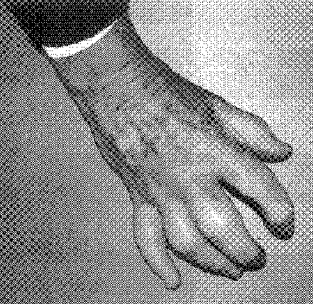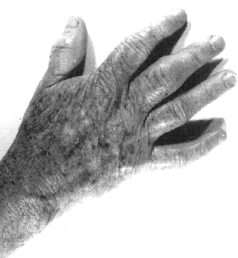FIG. 2 is a photograph showing osteoarthritis in the joints of the fingers and thumb. Osteoarthritis before the consumption of aqueous metal bicarbonate solution. Note the swelling and `claw-like` hand resulting from joint flexion and joint displacement. (The patient was pushing down with her hand `as hard as possible` in an attempt to place her hand flat on the underlying surface.); and